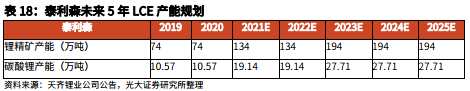 泰利森未來 5 年 LCE 產(chǎn)能規(guī)劃如下: