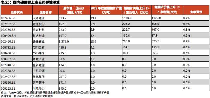彈性是判斷相關(guān)材料生產(chǎn)企業(yè)短期股價走勢的重要依據(jù)。A股鋰相關(guān)上市公司的業(yè)績彈性(假設(shè)鋰精礦價格上漲1%、其他加工費等保持不變,即產(chǎn)品漲價帶來的銷售收入變動全部形成利潤;所得稅25%,對上漲的凈利潤測算上市公司業(yè)績的彈性)如下所示:
