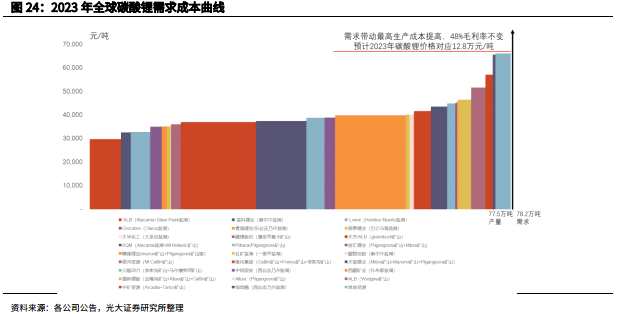 碳酸鋰總需求推動價格上漲。當碳酸鋰供需緊張時,將推動高成本產(chǎn)能釋放增加供給,價格隨最高生產(chǎn)成本上漲。將最高生產(chǎn)成本加上一定毛利可以推算碳酸鋰未來價格走勢。
