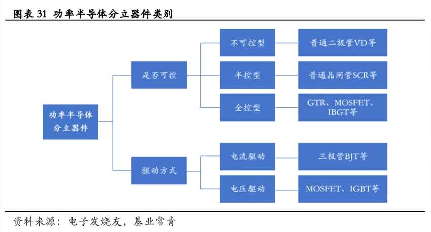 功率半導(dǎo)體按是否可控可分為不可控型、半控型、全控型三類,其中全控型功率半導(dǎo)體技術(shù)要求最高,主要包括MOSFET、IGBT、GTR等產(chǎn)品,全控型產(chǎn)品的大部分市場份額被國外廠商占據(jù),是目前國產(chǎn)替代的主要方向;按驅(qū)動方式可分為電流驅(qū)動和電壓驅(qū)動,電流驅(qū)動包括三極管BJT等,電壓驅(qū)動包括MOSFET、IGBT等產(chǎn)品。