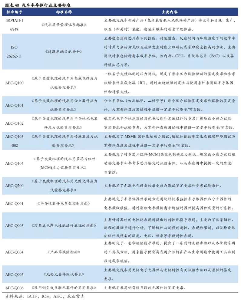 汽車半導(dǎo)體除了汽車行業(yè)通用的規(guī)范外,還有更嚴(yán)苛的車規(guī)級認(rèn)證標(biāo)準(zhǔn)。AEC-Q系列標(biāo)準(zhǔn)是針對汽車半導(dǎo)體的車規(guī)級認(rèn)證標(biāo)準(zhǔn),對汽車半導(dǎo)體提出了更嚴(yán)苛的要求,如車載芯片對故障率要求是百萬分之一,大部分車廠對車用芯片故障率要求甚至達(dá)到十億分之一,而消費(fèi)級芯片對故障率的要求只有千分之一。除此之外,汽車半導(dǎo)體對溫度、濕度、發(fā)霉、粉塵、鹽堿環(huán)境、EMC及有害氣體侵蝕等方面都有嚴(yán)格的要求。