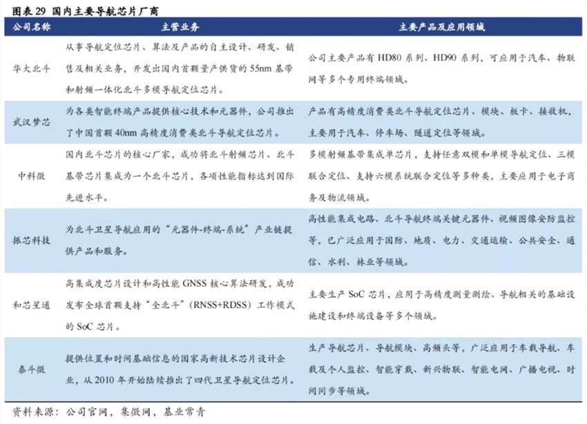國內(nèi)導(dǎo)航芯片產(chǎn)業(yè)鏈逐步完善,相關(guān)廠商不斷切入,應(yīng)用領(lǐng)域快速拓展。目前國內(nèi)主要導(dǎo)航芯片廠商基于傳統(tǒng)導(dǎo)航芯片領(lǐng)域不斷延展,逐漸發(fā)展出多模定位、模塊、智能算法、高精度等各類相關(guān)產(chǎn)品,并開始進(jìn)入運(yùn)動健康、安防監(jiān)測、廣播電視等諸多相關(guān)領(lǐng)域,相關(guān)廠商數(shù)量也不斷增加。隨著北斗導(dǎo)航系統(tǒng)的不斷完善,國內(nèi)導(dǎo)航芯片行業(yè)快速發(fā)展。