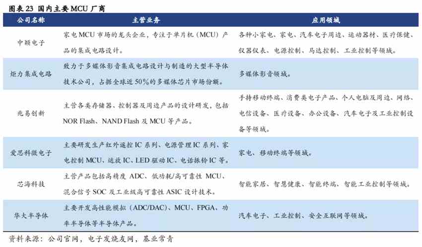 國外廠商占據(jù)汽車等高端MCU市場,且多為綜合服務(wù)提供商;國內(nèi)MCU廠商處于起步階段,主要應(yīng)用領(lǐng)域?yàn)橄M(fèi)電子等中低端市場。國外MCU廠商業(yè)務(wù)規(guī)模較大,MCU產(chǎn)品類別較為全面,且具有提供完整的控制系統(tǒng)解決方案的能力,是汽車MCU的綜合服務(wù)提供商。國內(nèi)MCU廠商的大部分產(chǎn)品主要應(yīng)用于家電、多媒體等消費(fèi)電子領(lǐng)域和工業(yè)控制領(lǐng)域,用于汽車領(lǐng)域的MCU成熟產(chǎn)品較少,且產(chǎn)品類別仍不夠全面,高端MCU產(chǎn)品量產(chǎn)較少。