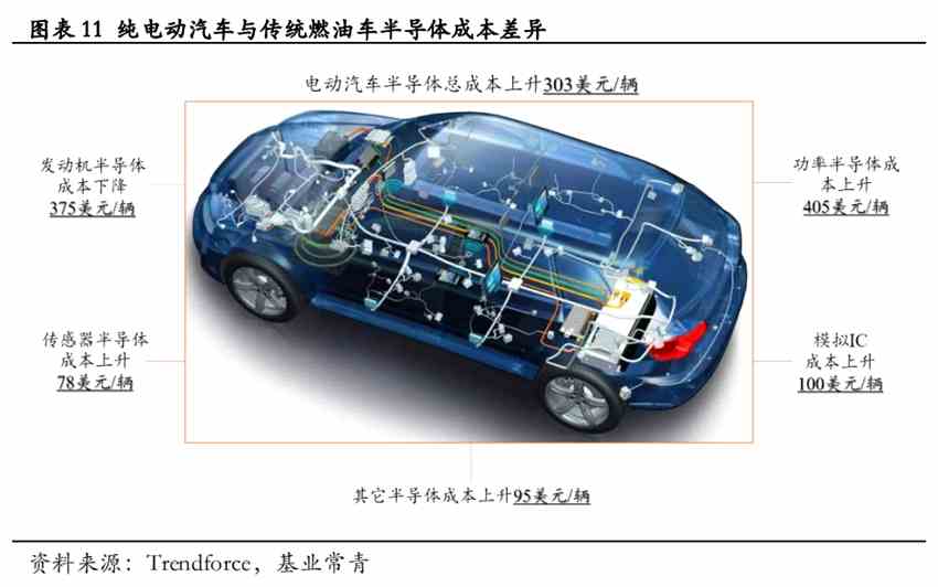相對于傳統(tǒng)燃油車,純電動車的半導(dǎo)體成本顯著增加。Trendforce數(shù)據(jù)顯示,純電動車的功率半導(dǎo)體成本上升405美元/輛、傳感器半導(dǎo)體成本增加78美元/輛、模擬IC成本上升100美元/輛、其它類半導(dǎo)體成本上升95美元/輛,但與發(fā)動機(jī)相關(guān)的半導(dǎo)體成本降低375美元/輛??傮w來看,每輛純電動車的半導(dǎo)體總成本上升303美元,純電動車半導(dǎo)體成本為傳統(tǒng)燃油汽車的1.67倍。