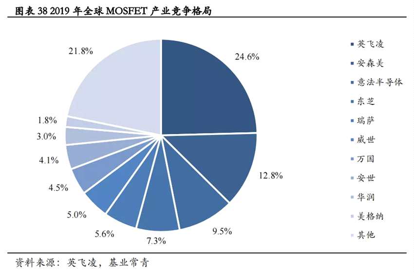 國外頭部廠商占據(jù)全球MOSFET市場81.2%的份額,國內(nèi)廠商安世半導(dǎo)體、【華潤微(688396)、股吧】位居第八、九位。2019年全球MOSFET市場占有率前三位的廠商分別是英飛凌(24.6%)、安森美(12.8%)、意法半導(dǎo)體(9.5%),CR3達(dá)46.9%;國內(nèi)廠商安世半導(dǎo)體排名第八(占4.1%市場份額),華潤微市占率進(jìn)入前十(占3.0%市場份額)。因此,在全球MOSFET市場的競爭中,國內(nèi)廠商仍處于追趕的狀態(tài)。