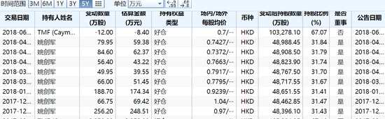 根據(jù)wind數(shù)據(jù),姚建軍確實(shí)未曾減持過,目前持股31.67%,為公司最大股東。而公司實(shí)控人為7大家族信托,包括公司四大董事,分別是姚劍軍家族、畢林家族、陳劍瑜家族、林加斌家族,7大信托合計(jì)持股64.72%。