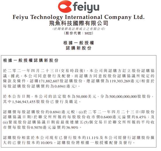 4月24日,飛魚科技發(fā)布公告,公司在4月23日通過發(fā)行及配發(fā),而認(rèn)購(gòu)方同意認(rèn)購(gòu)1.72億股,認(rèn)購(gòu)總金額1.19億港元。認(rèn)購(gòu)價(jià)0.6941港元,較4月23日收市價(jià)溢價(jià)8.45%,認(rèn)購(gòu)股份相當(dāng)于公司擴(kuò)大后總股本的10%。