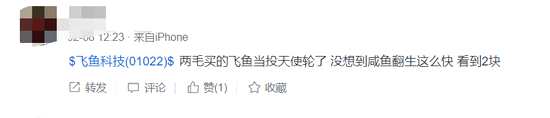 值得注意的是,今年2月,公司股價(jià)已經(jīng)實(shí)現(xiàn)翻倍式上漲,當(dāng)時(shí)公司并未有利好消息,不過,在當(dāng)時(shí)整個(gè)港股市場(chǎng)處于在炒虧損概念的邊緣反復(fù)試探。有網(wǎng)友表示,“兩毛買的飛魚當(dāng)投天使輪了,沒想到咸魚翻身這么快”。