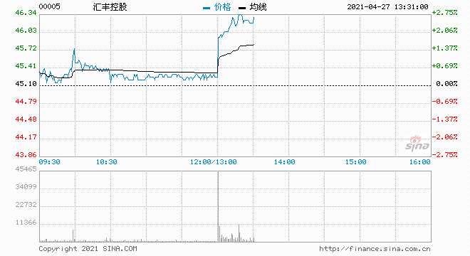 摘要: 4月27日消息,匯豐控股午后直線拉漲,現(xiàn)漲2%,報46港元,最新市值9544.61億港元。