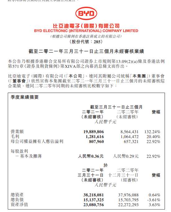 摘要: 4月28日消息,比亞迪(002594,股吧)電子在港交所披露2021年第一季度未經(jīng)審核業(yè)績(jī),公司2021年Q1營(yíng)收198.9億元,去年同期85.64億元,同比增長(zhǎng)132.24%。