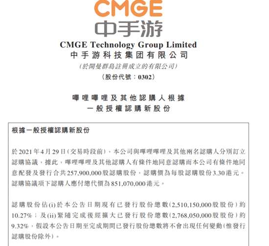 4月29日,嗶哩嗶哩參與中手游配股。根據(jù)公告,中手游擬本次配售2.58億股,占擴大后股本的9.32%。具體來看,中手游以每股3.3港元(折讓9.84%)向嗶哩嗶哩-SW(09626)、Wide Fortune及Century Network分別發(fā)行1.98億股、5640萬股及350萬股。相當(dāng)于擴大股本7.15%、2.04%及0.13%。所得款項凈額8.49億元。