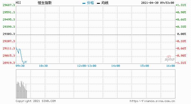 摘要: 4月30日消息,港股低開(kāi)低走,恒生指數(shù)跌幅擴(kuò)大至1%,科技股、餐飲股走弱。成分股中,美團(tuán)跌2.59%,阿里巴巴跌2.51%,蒙牛乳業(yè)跌、海底撈跌近2%,騰訊控股跌1.50%。