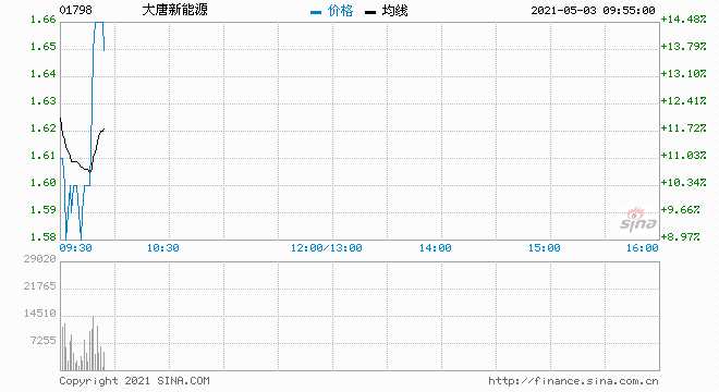 摘要: 大唐新能源(1798.HK)跳空高開14.48%報(bào)1.66港元,最新市值121億港元。