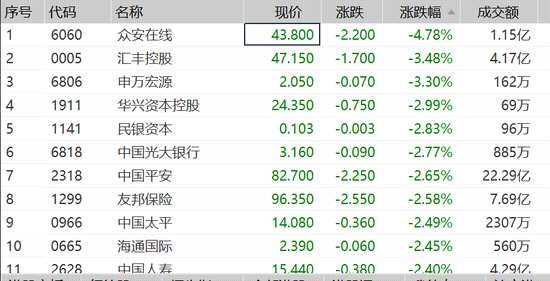 金融股集體大跌,眾安在線跌近5%,匯豐跌超3%,申萬(wàn)宏源(000166,股吧)跌超3%,光大銀行(601818,股吧)、中國(guó)平安、友邦等集體大跌。