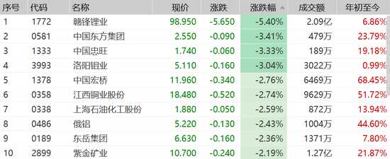 有色股繼續(xù)上周跌勢(shì),贛鋒鋰業(yè)(002460,股吧)跌超5%,【東方集團(tuán)(600811)、股吧】(600811,股吧)、中國(guó)忠旺、洛陽(yáng)鉬業(yè)等集體跌超3%。
