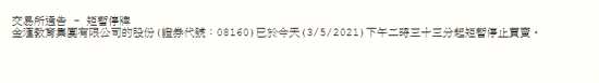 5月3日消息,金匯教育集團公布,公司股份已于今天下午二時三十三分起短暫停止買賣。此前公司股價一度跌超80%。