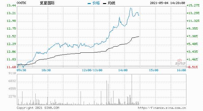 5月4日消息,復(fù)星國際午后拉漲,現(xiàn)漲10.63%,報12.9港元,最新市值1080.68億港元。
