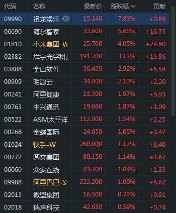 恒生科技指數(shù)漲超1% 祖龍娛樂(lè)漲近8%小米集團(tuán)漲超4%