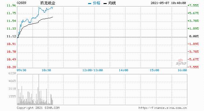 紙業(yè)股全線上漲,玖龍紙業(yè)(2689.HK)大漲超7%,理文造紙漲超5%,晨鳴紙業(yè)(000488,股吧)漲超4%。