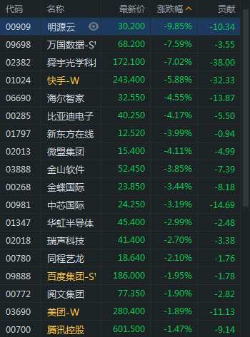 恒生科技跌幅擴(kuò)大至2.14% 明源云跌近10%快手跌近6%