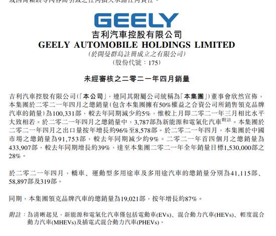 摘要: 5月10日消息,吉利汽車在港交所披露未經(jīng)審核2021年4月銷量,2021年前4個月汽車總銷量為433907部,較去年同期增長約39%,達至本集團二零二一年全年銷量目標(biāo)1530000部之28%。