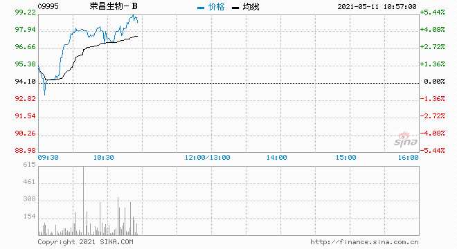 榮昌生物-B(9995.HK)直線拉升漲4.36%,報98.2港元,最新總市值481億港元。