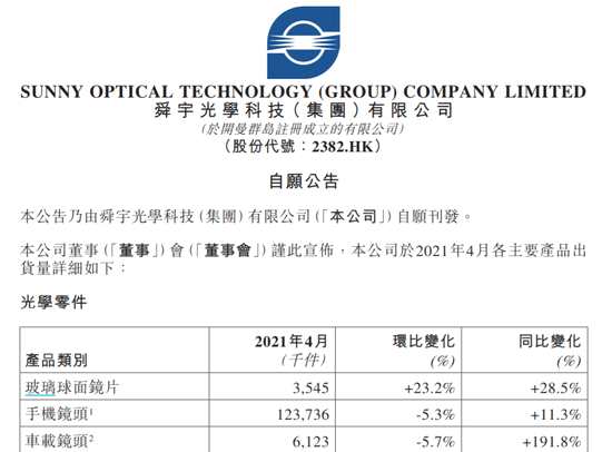 舜宇光學(xué):4月手機鏡頭出貨量為1.23億件 同比增11.3%