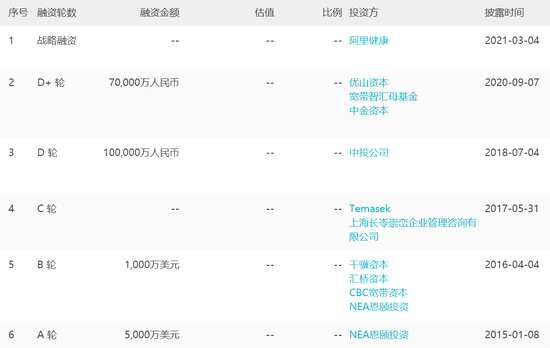根據(jù)wind企業(yè)庫,公司目前進行了6輪融資,淡馬錫、中投公司、中金資本、阿里健康為公司投資方,
