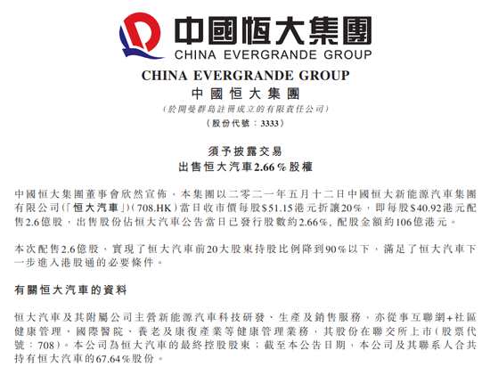 中國恒大:出售恒大汽車2.66%股權 每股40.92港元配售2.6億股