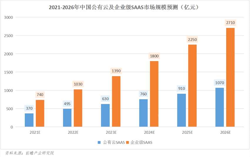 前瞻預測,2021年我國公有云SAAS市場規(guī)模將達到370億元,企業(yè)級SAAS市場規(guī)模達740億元,預計到2026年我國公有云SAAS市場規(guī)模將突破1000億元,企業(yè)級SAAS市場規(guī)模將突破2700億元。