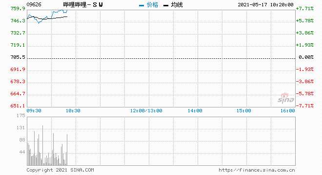 嗶哩嗶哩跳空高開6.31% 報750港元