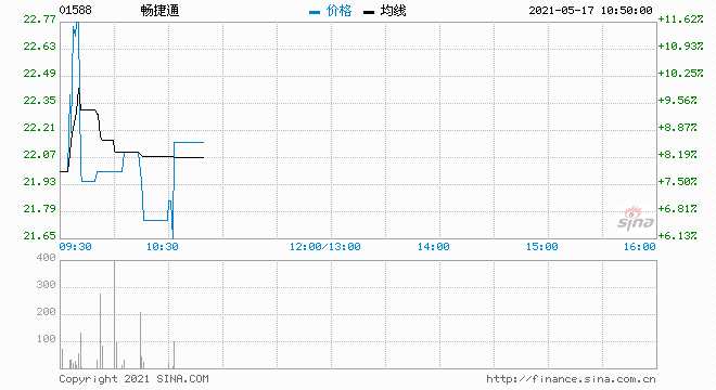 暢捷通(1588.HK)漲6.62%,報21.75港元,盤中一度漲逾12%,最新總市值47億港元。