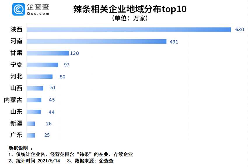 從地域分布來看,數(shù)據(jù)顯示,目前我國在業(yè)、存續(xù)的辣條相關(guān)企業(yè)主要分布在北方地區(qū),如陜西、河南、甘肅等省份。其中陜西省擁有最多的辣條相關(guān)企業(yè),共630家,河南省排名第二,共431家,甘肅省排名第三,有130家。此外,寧夏、河北、山西等省份均入圍前十。