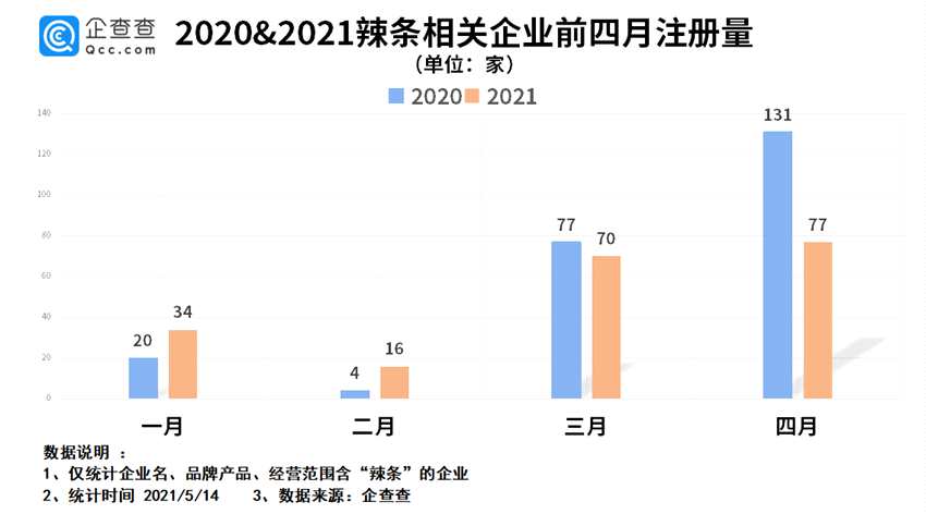數(shù)據(jù)顯示,2021年前4月,我國辣條相關(guān)企業(yè)注冊量為197家,同比下降了15.1%。其中,3、4月份注冊量分別為70家、77家,均呈同比下降趨勢。