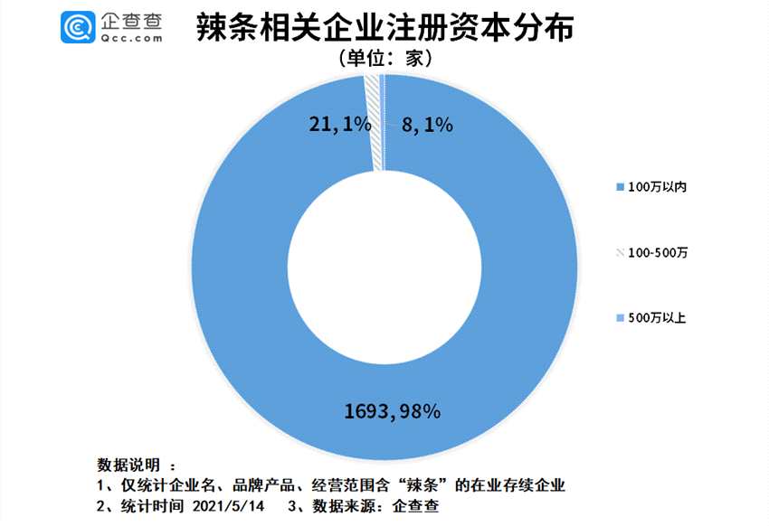 日前,“辣條之王”衛(wèi)龍在港交所披露招股文件,沖刺“辣條第一股”。企查查數(shù)據(jù)顯示,目前我國共有1722家辣條相關(guān)企業(yè),陜西、河南分別以630家、431家高居前兩位。2020年,辣條相關(guān)企業(yè)新注冊706家,同比增長22.8%,今年前4月新增197家。此外,98%的企業(yè)注冊資本低于100萬。