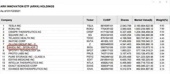 今年1月初,百度宣布與吉利組建的集度汽車(chē),正式向造車(chē)進(jìn)軍。消息出來(lái)后,百度一度被“女版巴菲特”木頭姐 Cathrine Wood 高度看好,躋身 ARK 的第 8 大持倉(cāng)(下圖),也是僅次于特斯拉后的第二支“汽車(chē)概念股”,木頭姐差不多把它當(dāng)成了下一個(gè)“特斯拉”。
