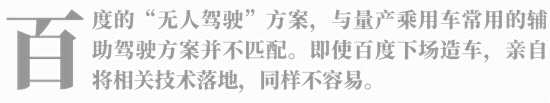 換言之,百度的“L4 無(wú)人駕駛”方案,與量產(chǎn)乘用車(chē)常用的輔助駕駛方案不見(jiàn)得很匹配,即使百度下場(chǎng)造車(chē),親自將相關(guān)技術(shù)落地,同樣不容易。