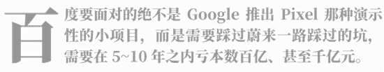 換句話(huà)說(shuō),百度要面對(duì)的絕不是 Google 推出 Pixel 時(shí)那種演示性的小項(xiàng)目,而是需要踩過(guò)蔚來(lái)一路踩過(guò)的坑,在 5~10 年之內(nèi)虧本數(shù)百億、甚至千億元。