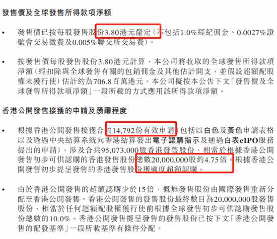 根據(jù)香港公開發(fā)售接獲合共14,792份有效申請,涉及合共9507.3萬股,相當(dāng)于香港發(fā)售股份總數(shù)2000萬股約4.75倍。