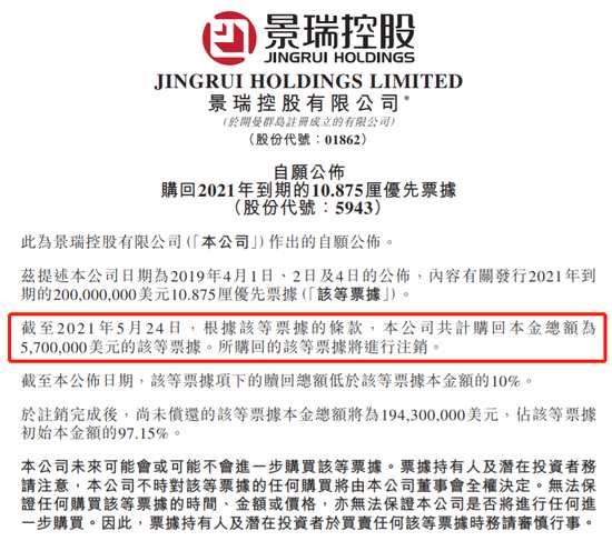 2021年5月24日,景瑞控股發(fā)布公告,公司斥資570萬美元回購于2021年到期的2億美元利率為10.875%的優(yōu)先票據(jù)?;刭徍蟮钠睋?jù)將被注銷。截止公告發(fā)布日,該批債券的贖回總額低于相關(guān)債券本金金額的10%。注銷后,該批債券未償付票據(jù)的本金為1.943億美元,約占票據(jù)初始本金的97.15%。