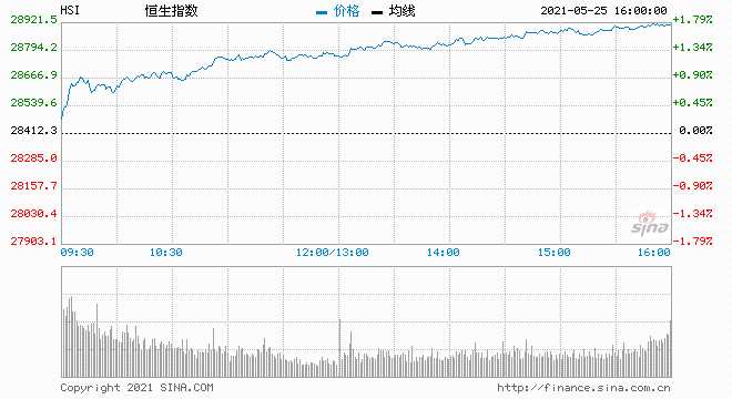 5月25日消息,美股周一收高,大型科技股與經(jīng)濟重啟概念股普遍上揚。今日看盤,恒生指數(shù)高開0.17%,隨后漲幅擴大。截至收盤,恒生指數(shù)漲1.75%,報28910.86點;國企指數(shù)漲1.42%,紅籌指數(shù)漲0.7%。
