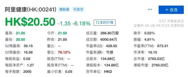 營收不及市場預(yù)期 阿里健康股價開盤大跌超6%