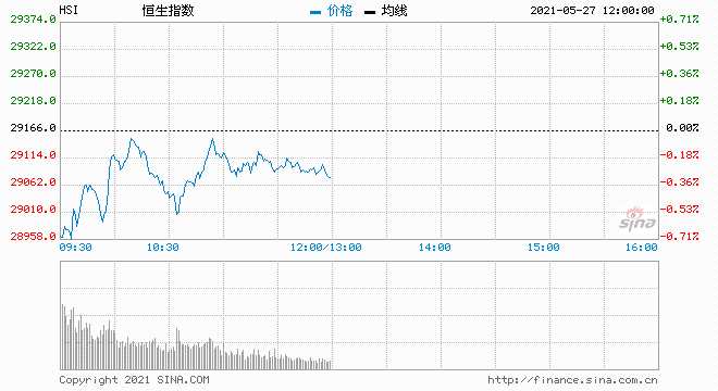 5月27日消息,美股周三小幅收高,經(jīng)濟(jì)重啟概念股推動大盤上揚(yáng)。今日開盤,恒生指數(shù)低開0.57%,隨后跌幅收窄。截至午間收盤,恒生指數(shù)跌0.3%,報(bào)29078.02點(diǎn);國企指數(shù)跌0.41%,紅籌指數(shù)漲0.1%。美團(tuán)跌2.79%領(lǐng)跌藍(lán)籌。