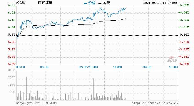 時代鄰里(9928.HK)現(xiàn)報6.24港元,漲4.87%,暫成交3673萬港元,最新市值61.5億港元。