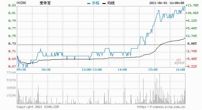 愛帝宮尾盤拉升轉(zhuǎn)漲,一度漲超12%,截至發(fā)稿,漲10.96%,報(bào)0.81港元,成交額1.65億港元。
