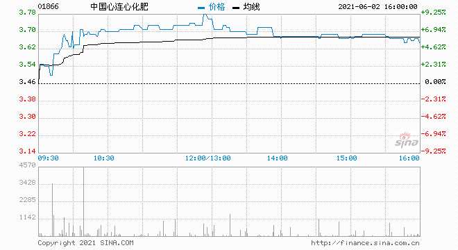 中國心連心化肥(01866.HK)股價(jià)沖高回落,盤中最大漲幅逾9%,收?qǐng)?bào)3.65港元,漲幅5.49%,最新總市值42.76億港元。