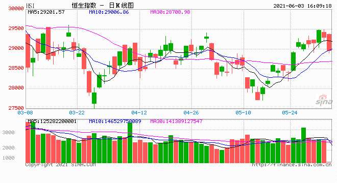 6月3日消息,美股隔晚缺乏方向,聯(lián)儲(chǔ)局褐皮紙顯示,美國(guó)經(jīng)濟(jì)于4、5月以較溫和速度擴(kuò)張,通脹壓力則暫仍并退減。香港特區(qū)立法會(huì)三讀通過(guò)《2021年收入(印花稅)條例草案》,落實(shí)本年度財(cái)政預(yù)算案中,提高股票印花稅至0.13%建議,有關(guān)調(diào)整將在今年8月1日生效。今日早盤(pán),恒指高開(kāi)低走,午后恒指再度失守29000點(diǎn),截至收盤(pán),恒指跌1.13%,報(bào)28966.13點(diǎn),國(guó)企指數(shù)跌1.14%,紅籌指數(shù)跌0.54%。