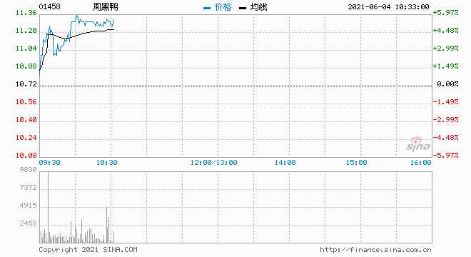 周黑鴨(1458.HK)再度拉升漲6%,報11.36港元有望刷新歷史新高價,總市值達270億港元。