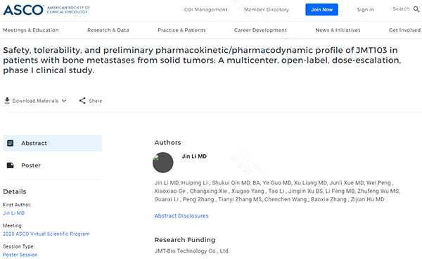 美國臨床腫瘤學(xué)會American Society of Clinical Oncology(ASCO)成立于1964年,是全球領(lǐng)先的腫瘤專業(yè)學(xué)術(shù)組織,旨在預(yù)防癌癥及改善癌癥服務(wù),本次年會是全球腫瘤領(lǐng)域最權(quán)威的學(xué)術(shù)交流盛會之一。在2020年ASCO年會中,集團(tuán)公布兩個(gè)創(chuàng)新藥的最新臨床試驗(yàn)結(jié)果(壁報(bào))。一項(xiàng)是鹽酸米托蒽醌脂質(zhì)體注射液用于晚期復(fù)發(fā)或轉(zhuǎn)移性乳腺癌患者的II期研究,一項(xiàng)是JMT103用于腫瘤骨轉(zhuǎn)移患者的I期研究。