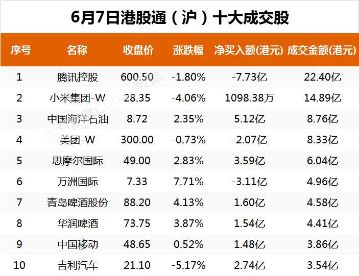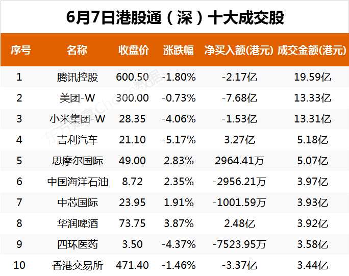 6月7日,截至港股收盤,南向資金當日成交凈買額為14.47億港元。其中,港股通(滬)當日成交凈賣額為3.51億港元;港股通(深)當日成交凈賣額為10.96億港元。